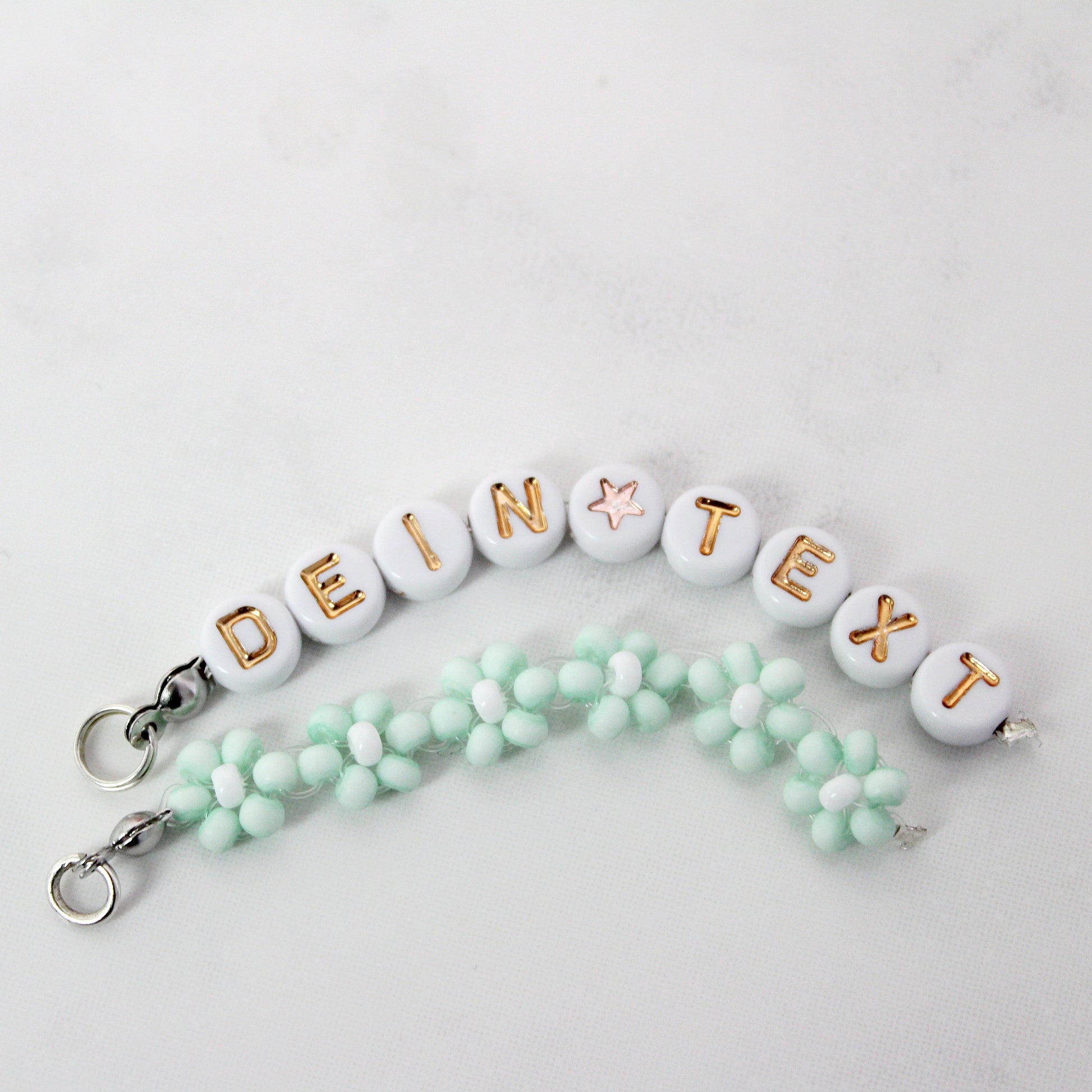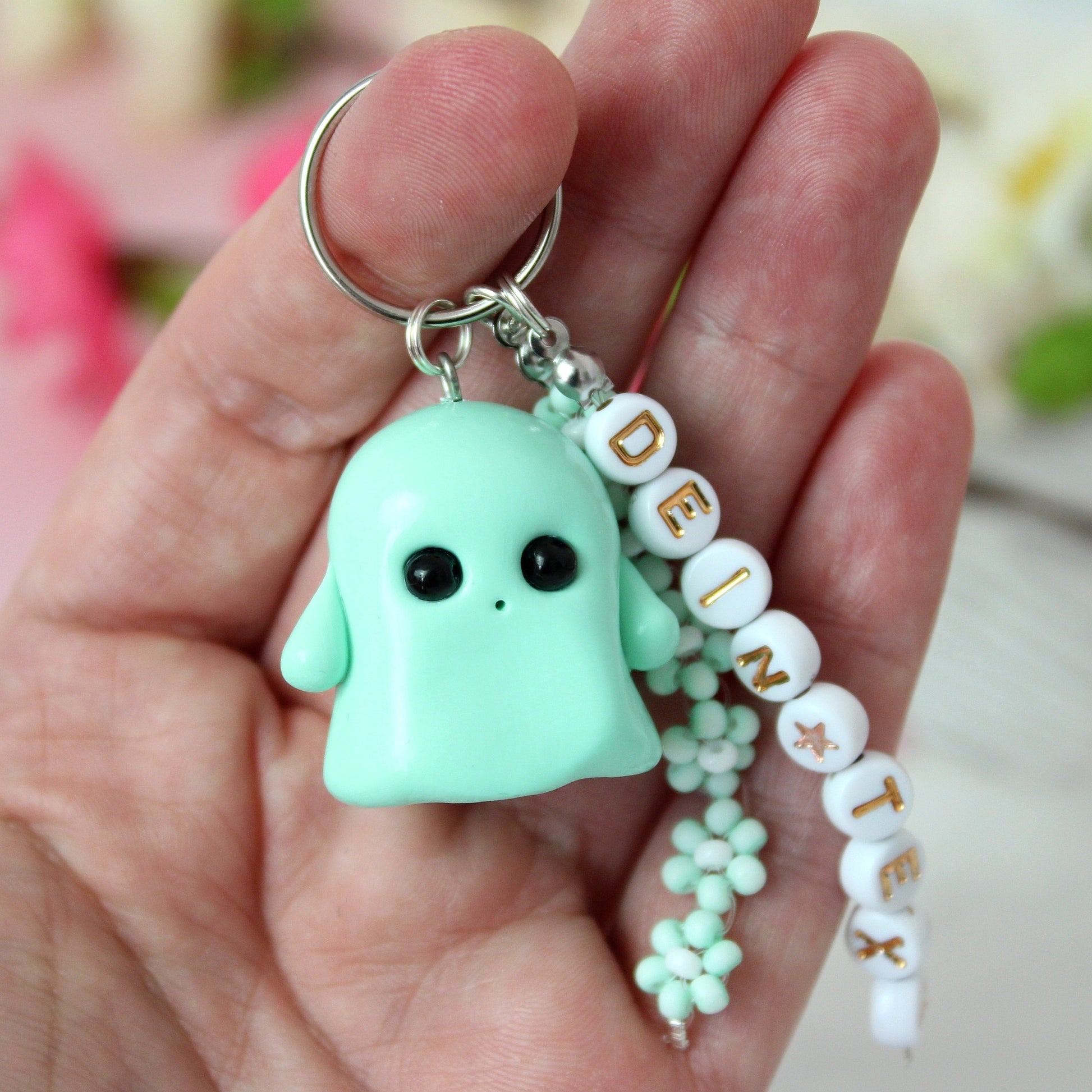 • Maße: Geist Höhe ca. 3cm, Länge Blumenanhänger ca. 5cm, Länge Buchstaben variiert je nach Text, Schlüsselring ø2cm